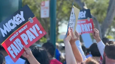 "미키는 공정한 급여를 원할 겁니다." 노동자들은 공원 입구 근처의 디즈니랜드 밖에서 구호를 외쳤습니다.